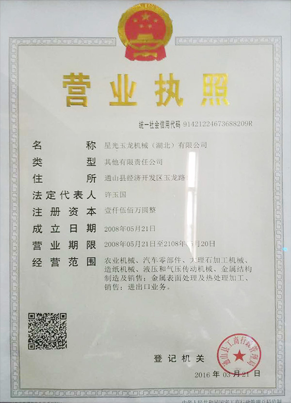 星光玉龍機(jī)械(湖北)有限公司2023年通過了兩化融合貫標(biāo)管理體系、2024年通過ISO9001-2016質(zhì)量管理體系認(rèn)證。